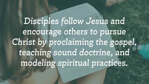 Disciples follow Jesus and encourage others to pursue Christ by proclaiming the gospel, teaching sound doctrine, and modeling spiritual practices.